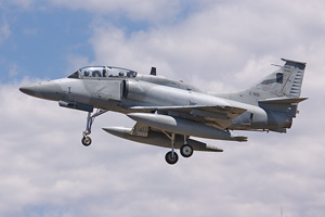 | The latest addition to Argentina's front line strength also took part in the exercise. Grupo Aéreo 5 de Caza from Villa Reynolds, San Luis, detached some of its A-4AR Fighting Hawks, along with one of the four two seater OA-4AR's seen here. Fitted with a downgraded F-16 radar, the Fighting Hawk was the best the FAA could hope for as a replacement for their ageing A-4P Skyhawks of Falklands/Malvinas fame. |