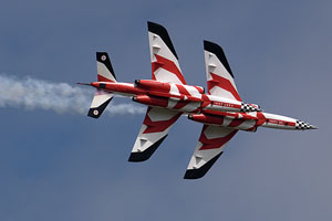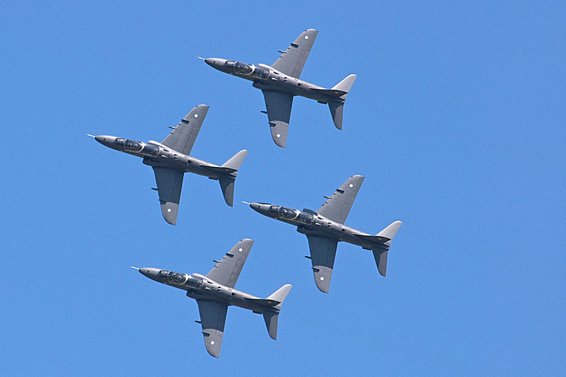 The Finnish Air Force's Midnight Hawks are in a somewhat different catagory. They are standard issue Hawk Mk.51 trainers in their normal grey colourscheme. Nevertheless, they put up a display with some accurate formation flying. Like the Portuguese above, it was their first display in the Netherlands. |