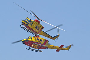 How do you cope with a 2,5 km long runway if you want to demonstrate a Search and Rescue operation? Simple, you do it simultaneously with a pair of helicopters. When it was all said and done, this shot could be made of the pair of Leeuwarden based AB.412SP helicopters from 303 sq. Not a sight one would usually see. |