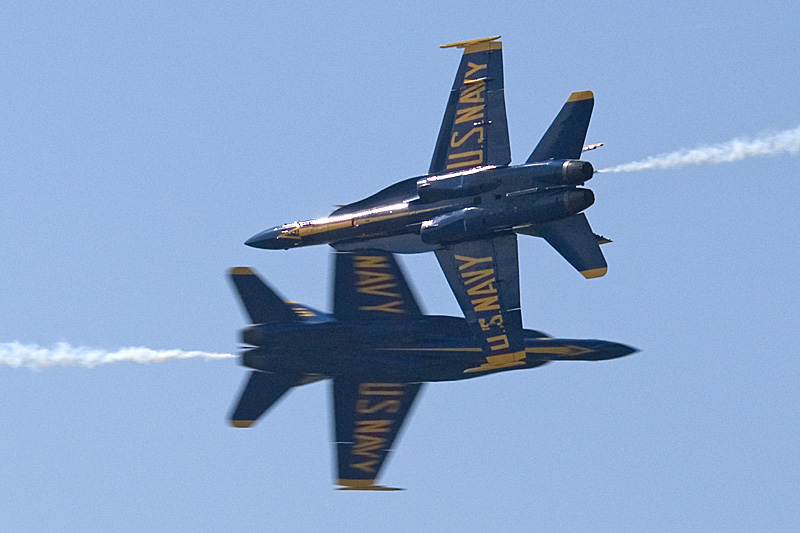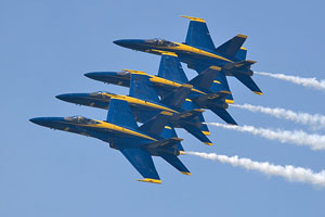 The Blue Angels display concluded Leeuwarden's Open Days for 2006. Equipped with front line jets instead of advanced trainers like the European teams, the Blue Angels show is completely different from their European counterparts. The British Red Arrows concentrate on an aerial ballet with their nine small Hawk trainers, as do others like the French Patrouille de France. The Blues on the other hand fly front line F/A-18 Hornet fighters and demonstrate the raw power of this type of aircraft, along with some precision formation flying. Both require equal pilot skills and are fun to watch and photograph though.. |