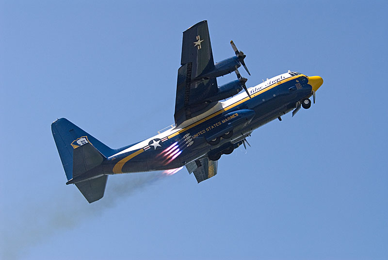Then, the moment came. The final act of 2006's KLu airshow. Each Blue Angels display is preceded by a display by their supporting C-130 Hercules. This C-130T is seen here taking off with the aid of a set of solid fuelled rockets, producing not only extra thrust but some extra noise and an acrid smell as well. Unfortunately, these JATO take-offs will be a thing of the past soon, as the rockets are no longer being produced. |