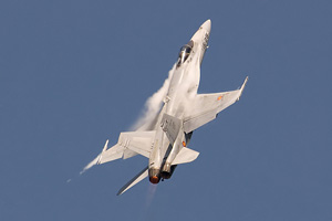 The same can be said of this Spanish Air Force EF-18A Hornet. A standard squadron jet from Zaragoza's Ala 15 was luck to fly in the still moist air over Leeuwarden which resulted in this beautiful vortex streaming from the jet's strakes during the Hornet's climb to altitude. |