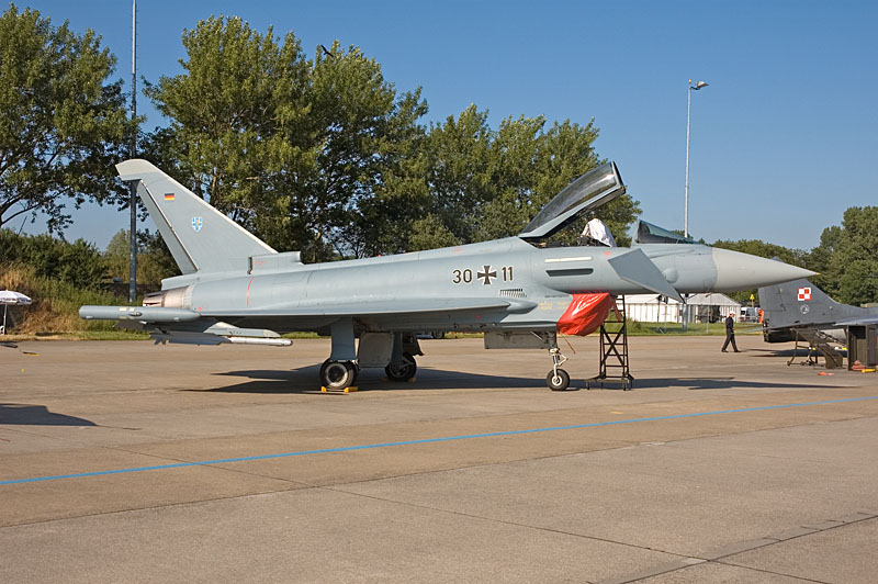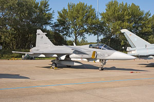 The Eurofighter Typhoon, or EF.2000 if you will, made an interesting comparison right next to one of the other two Eurocanards, the Gripen. A French Rafale would have made the trio complete, but this type has been firmly overtaken by even the Typhoon when it comes to service deliveries. |