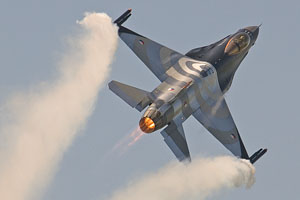 Captain Gert Jan Vooren was his usual self flying display-sprayed F-16AM J-055. Liberal use of afterburner, smoke and sometimes even flares coupled with a spirited display more than makes up for the lack of a full multi-jet demonstration team in the KLu. |