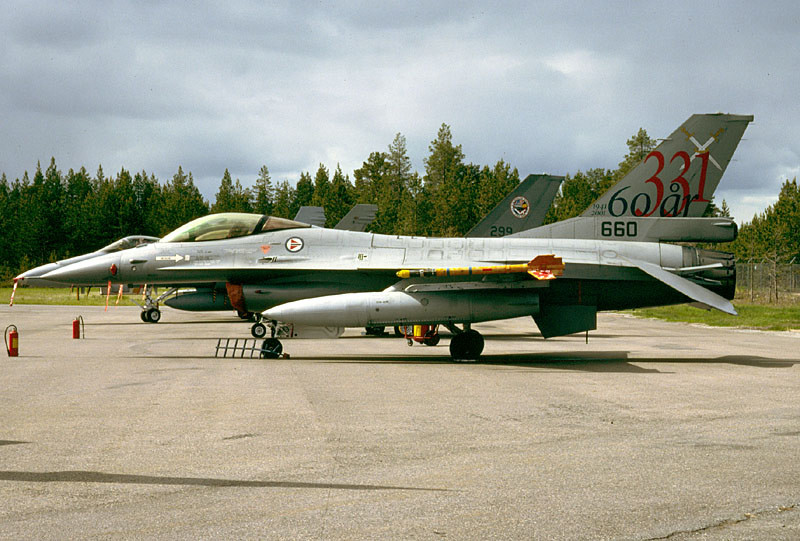 One of the two Royal Norwegian Air Force's F-16's to be displayed in the static park was this example, 660, from 331 Skvadron based at Bodø Air Base. 331 Skv had celebrated it's 60th annviversary in 2001 and the jet's tailfin was marked accordingly. |