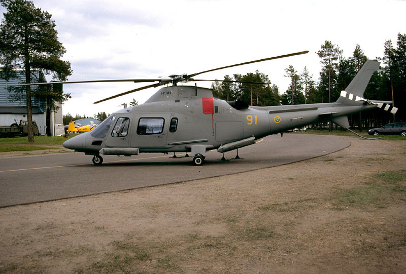 Rotary winged aircraft are nowadays operated by a joint Air Force, Army and Navy command. A new addition to Sweden's military helicopter fleet is the Agusta A.109E Power, known as Hkp-15 in Swedish service. However, despite wearing Swedish roundels, this example I-POWR is only leased from Agusta for training crews and pending delivery of Sweden's own A.109's. Sweden plan to use the A.109 for tactical training and transport of personnell. Eight of the twenty on order will be outfitted for naval missions. |