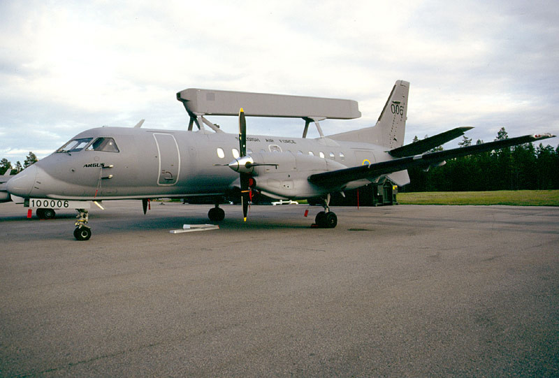 Boeing's E-3 Sentry is not the only Airborne Early Warning in service in the world. There are many more and Sweden's SAAB S-100B Argus, based on the SAAB 340 regional airliner, is one of them. Mounted on top of the roof of 100006/006 is Ericsson's EriEye radar installation. Flown by the FSR Division within F16 at Malmen, the Argus can be relatively easily converted to the transport role by removing the antenna and associated systems built in the fuselage. |