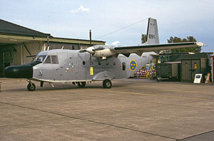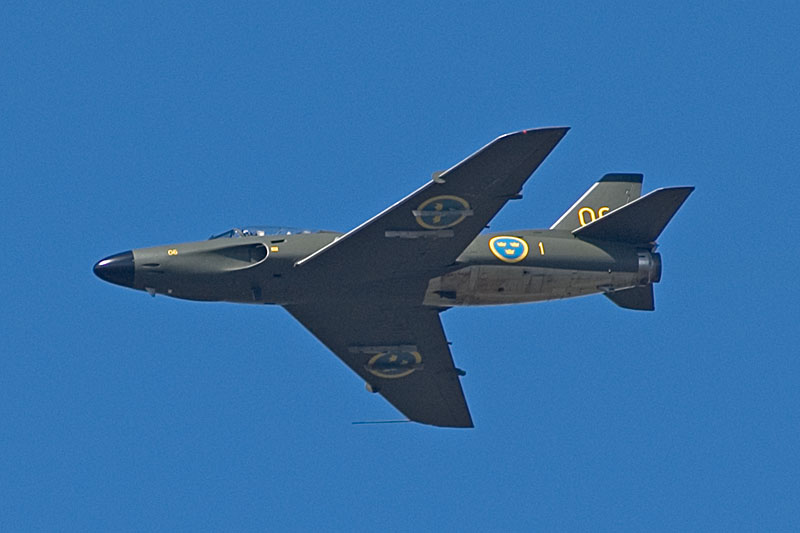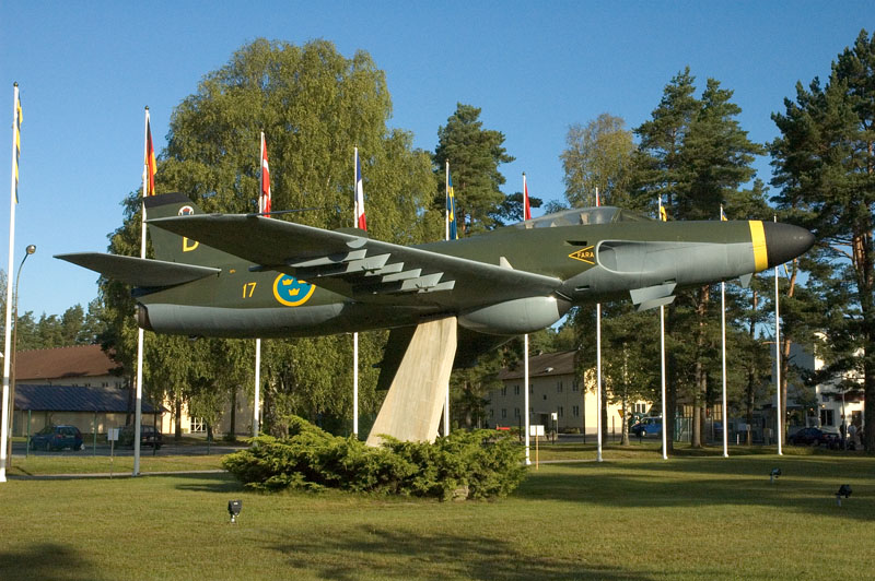 This is something that did succeed in the case of the SAAB J-32B Lansen. In this image, J-32B 32606/06 in the markings of long/disbanded fighterwing F1 has been caught during it´s display at Ronneby. Note the absence of the bulged radome under the fuselage of the J-32B fighter. Ronneby´s gate guard on the other hand displayed on the top of this page is an A-32A attack variant with the navigation and attack radar clearly visible. |