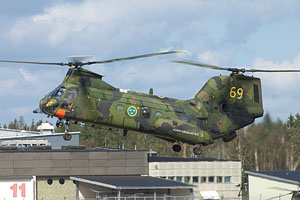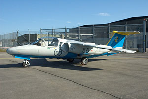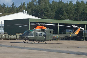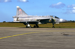 Only 10 years ago the backbone of the Swedish Air Force and now almost a memory, the SAAB JA-37 Viggen. This modernized JA-37DI belongs to Ostersund´s F4 wing. This unit is the last to operate the fighter version of the Viggen and will cease flying during 2005. 37413/13 can be seen here being towed pilotless along the taxyway. It can only be hoped that funds to maintain a Viggen in flying condition can be found somewhere. |