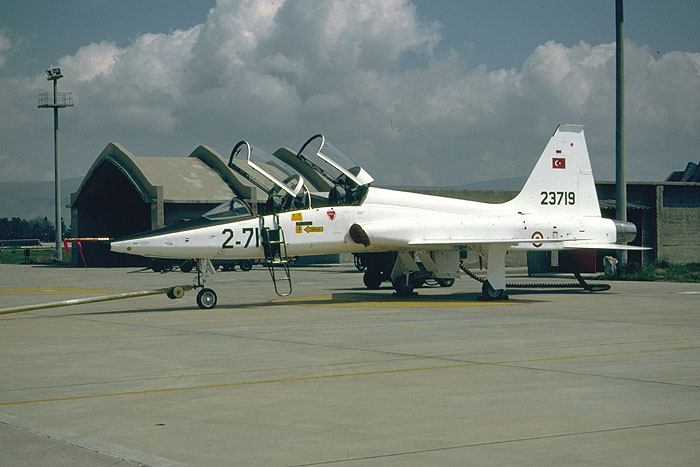 | F-5B 21283 Konya, 28 April 1999. F-5B two-seater 21283 of 132 Filo awaits it's crew for the next flight. |
