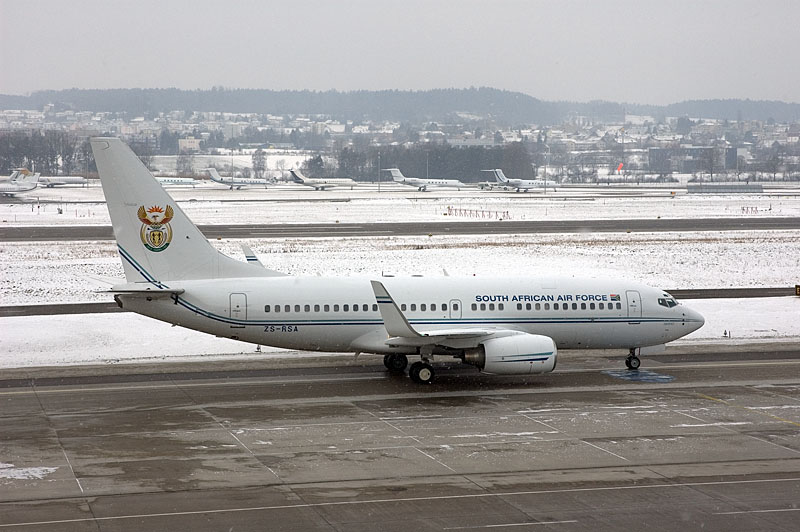 Long range versions of small, originally mid ranged airliners are becoming popular VIP types. This Boeing 737-700 ZS-RSA, also known as a BBJ (Boeing Business Jet) is the transport of the President of the Republic of South Africa, at the time of writing being Mr. Thabo Mbeki. It is seen here taxiyng out early on Saturday 29 January, the final day of the WEF 2005 Annual Meeting. It is part of No. 21 sq at Waterkloof