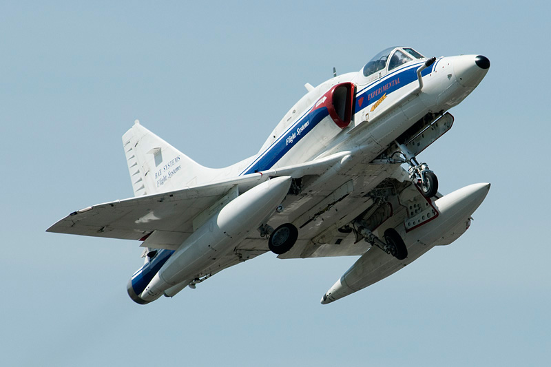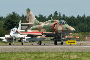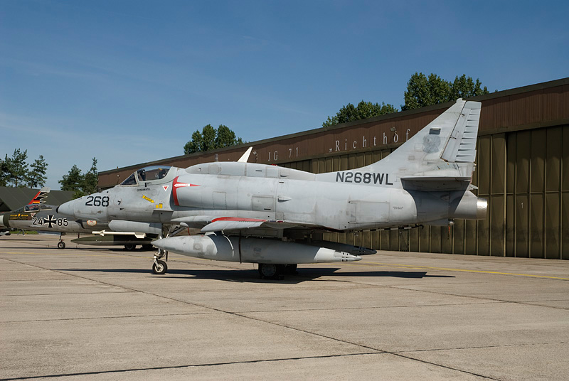 Wittmundhafen is home to another classic in military aviation, namely the Douglas A-4N Skyhawk. Although the Skyhawk has never seen service with any NATO nation other than the USA itself, the type can be seen and enjoyed in Germany. Flown by Flight Systems Inc., A-4N's are used for target facilities missions for the German forces. In 2000, four ex Israeli A-4N's took over from ex Danish TF-100F Super Sabres. So popular have been their services that another pair have been ordered more recently. Unlike the original quartet which wear gloss white with a blue trim, they are still in military colour schemes. Both are former Israeli Air Force, however this is most obvious with N262WL below right.