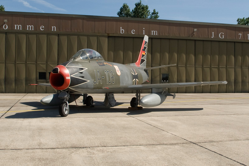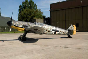 Home based at Wittmundhafen is Jagdgeschwader (Fighter Wing) 71 "Richthofen". The wing has been named for the famous German World War I ace Baron Manfred von Richthofen. Oldest of the historic aircraft on display was the Messerschmidt BF.109 seen to the right. In reality, this is a Spanish built specimen known as Hispano HA.1112M1L. It forms part of a small collection of historic aircraft which is to be found in the hangar behind the aircraft.