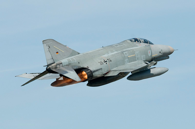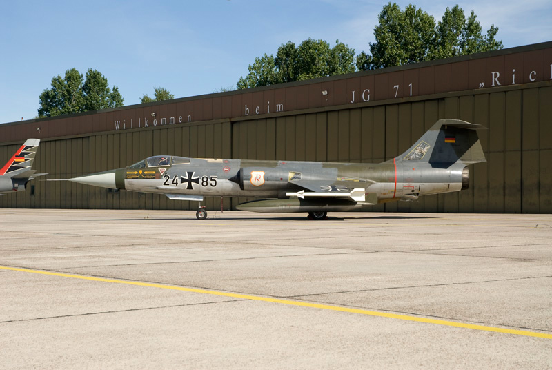 Starting in 1963, the Luftwaffe received the Lockheed F-104G Starfighter. JG 71 was to be the first Luftwaffe wing to operate the new type. The type's service carreer at Wittmundhafen would span a mere decade, as attrition with the F-104G proved to be so high that premature introduction of a new fighter type to make up losses was necessary. JG 71 alone lost 14 jets and sadly also eight pilots during the 1964-1974 period. In 1974, the McDonnell Douglas (now Boeing) F-4F Phantom II took over from the Starfighter at Wittmundhafen. For the next 34 years, the sight and sound of the Phantom has become a part of daily life around the base. |