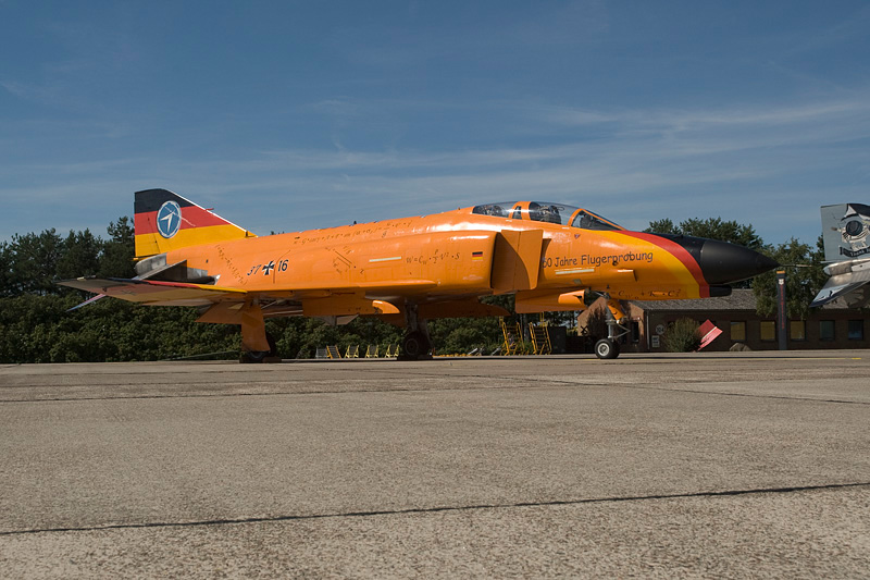 | Now that the type has entered the twilight of its carreer in the Luftwaffe, some aircraft have received anniversary or farewell colourschemes, the most recent ones have been assembled on this page. Fortunately, JG 71 managed to collect the farewell painted Phantoms from bases like Rheine-Hopsten as well as from Neuburg-Donau. To the left, and preserved between a hangar and some buildings close to the base's main gate is F-4F 37+11, which has been sprayed in a colour scheme centered around that unit's horse design from JG 72 "Westfalen" which disbanded at Rheine-Hopsten in 2002 and renamed FLZ F-4F (Fluglehrzentrum = Flight Training Centre). Other specially coloured Phatoms included 38+49 from JG 71 (below left) to celebrate 50 years of F-4 Phantoms world wide. Note the flags of those nations still flying the F-4, Japan, South Korea, Turkey, Iran, Egypt, USA and Germany. Below center F-4F 38+37 which was the farewell machine from JG 74 at Neuburg which has now converted to the Eurofighter EF.2000. Below right the bright orange painted 37+16 from Wehrtechnische Dienststelle 61 (Flight Test Unit 61) from Manching. The formulas stencilled all over the jet are equations important in aerodynamics. |