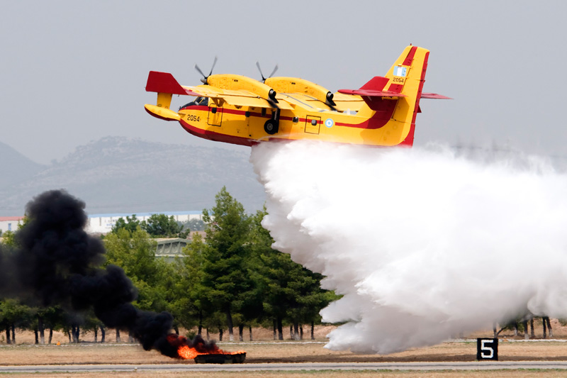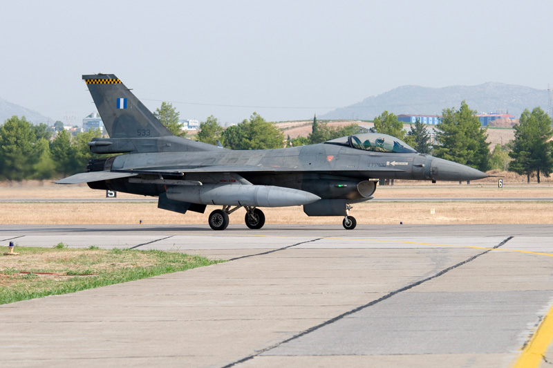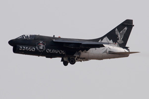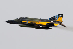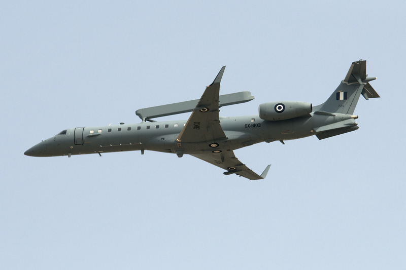 Three types that make up Greek air power. To the left, one of the A-7E Corsairs still in operation. Newly supplied A-7H's have now been retired, however some of the 54 A-7E's and 18 TA-7C's are still available for two squadrons within 116 PM at Araxos. The specially painted A-7E is from 336 MTV "Olympos". The F-16C Block 52+ at centre is part of 337 Mira "Ghost" which is based at Larissa within 110 PM. Some, but not all, are fitted with conformal fuel tanks. The jets' focus is on air defence, working with the EMB.145H's above. Old, but still going strong are the RF-4E Phantoms from 348 MTA at Larissa as well. All these types took part in a mass take off, providing excellent photographic opportunities during both taxiing past the public as well as during launch and recovery. |