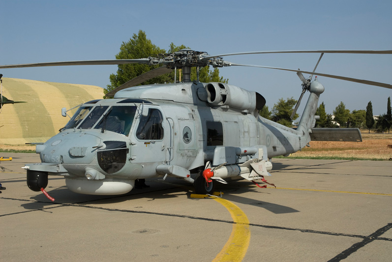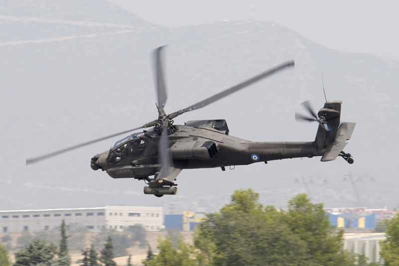 Every self respecting air force nowadays shows its rotary wing hardware during an air power demonstration of some sort. The Greek were no exception. To the left, a Greek Army AH-64A Apache is seen cavorting over the base during a CSAR demonstration, the actual pull-out being done by an AS.332C1 Super Puma. Part of the static display was the S.70B-6 Aegean Hawk to the right. This helicopter operates from Greek Navy frigates in an Anti Submarine role. |