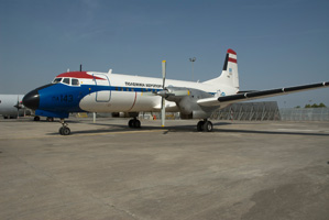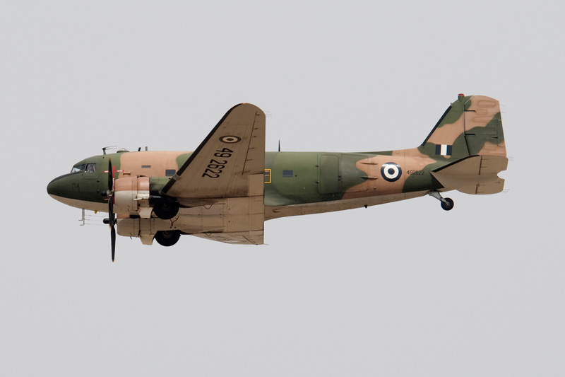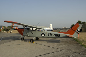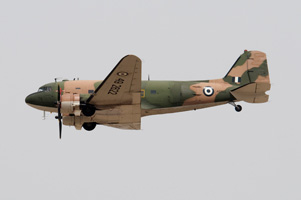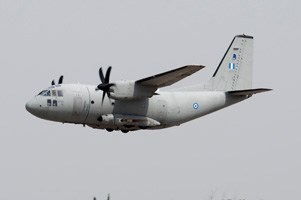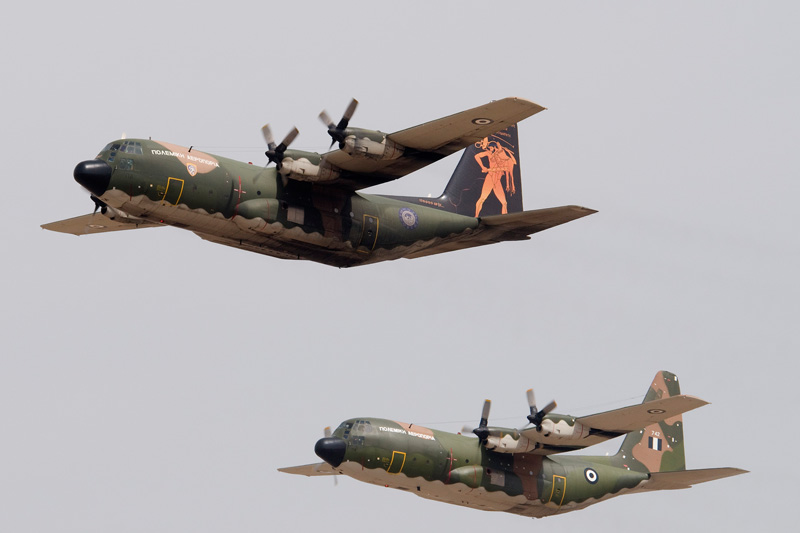 The Hellenic Air Force operates a wide variety of transports. The newly acquired Alenia C-27J Spartan could be admired both in the static park as well as during a mass flypast of most types in the inventory. The Hellenic Air Force has been unique in operating the Japanese built NAMC YS.11 transport. Equally unique must have been that the only surviving example of the type could be seen in Tanagra's static park! Having been retired from transport duties, the type is now used for navaid calibration. The mass flypast mentioned before included this pair of C-130H Hercules, the front one displaying artwork to commemorate the type's 170.000 hours flown until 2007. |