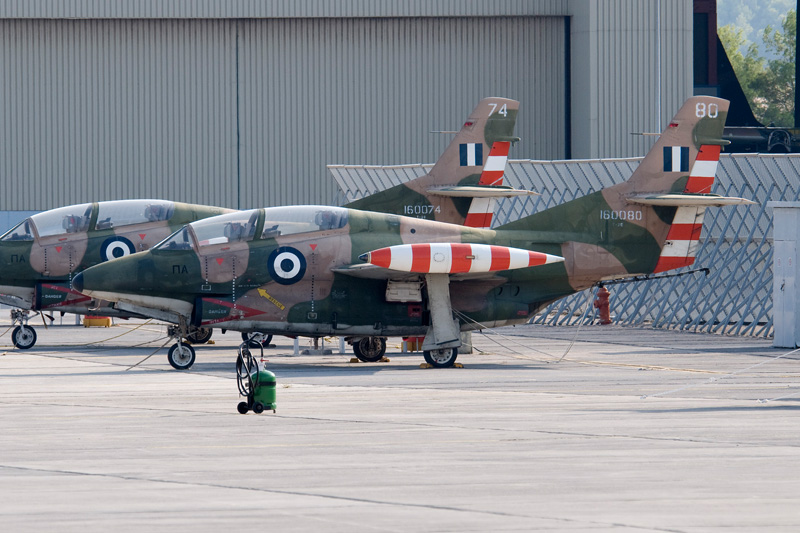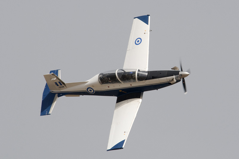 | In the HAF training is done on some rather extraordinary equipment as far as European air forces go. For elementary traing, the HAF relies on the Cessna 172 in its military guise. As a military trainer the type is known as the T-41D Mescalero and can be seen to the left. Advanced training has been the domain of the Rockwell T-2 Buckeye. Two versions are in operation, the T-2C and the T-2E. The jet at centre is a T-2E. Most recent addition and seen here during its display over Tanagra is the Beech T-6A Texan II, a complete redesign of the Pilatus PC.9 and used for primary training replacing Cessna T-37 jets. |
